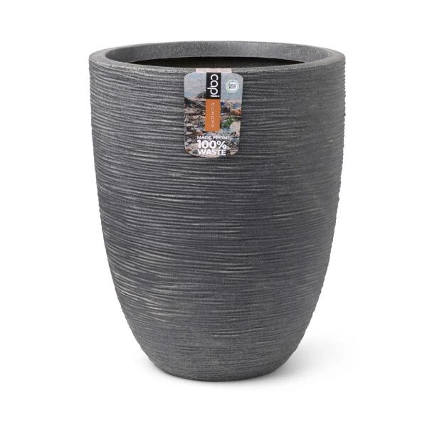 Een hoge bloempot met een speelse ribstructuur, gemaakt uit 100% gerecycleerde materialen. Geschikt om zowel binnen als buiten te gebruiken.