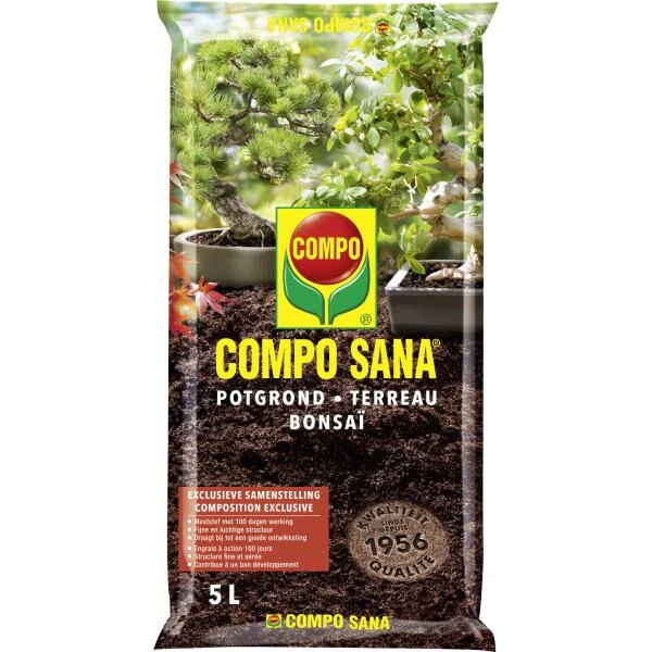 Het verpotten van een bonsai is sterk afhankelijk van de wortelgroei van elke soort bonsai. Verpot om de 2 jaar jouw kamerbonsai. Specifieke potgrond voor de aanplanting en verpotting van bonsais binnen- en buitenshuis. De structuur en hoge stabiliteitzorgen voor de vereiste verhouding water/lucht voor een goede plantenontwikkeling, een stevig wortelgestel en een uitgebalanceerde voeding.