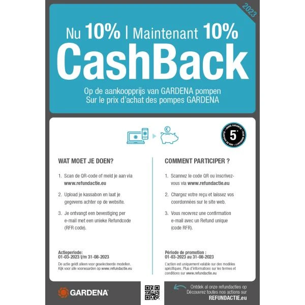 De hoogwaardige en energiezuinige dompelpomp van Gardena heeft een laag energieverbruik en is niet alleen krachtig maar ook zeer efficiënt. De motor van de dompelpomp heeft een vermogen van 300 W. Bij een maximumdruk van 0,6 bar en een opvoerhoogte van 6 m kan maximaal 9000 liter water per uur worden gepompt met een vlakke aanzuiging tot 2 mm.