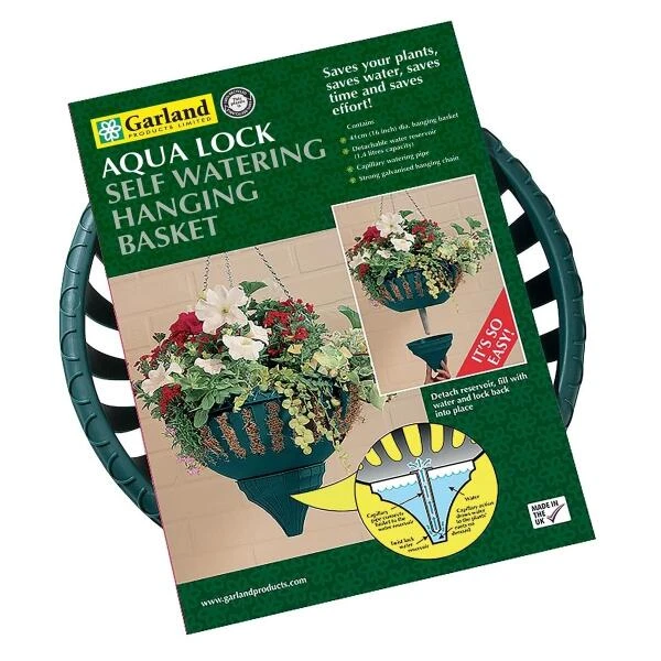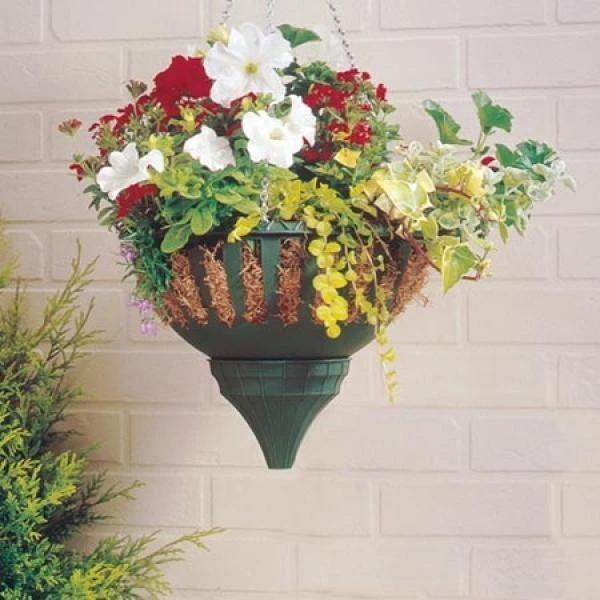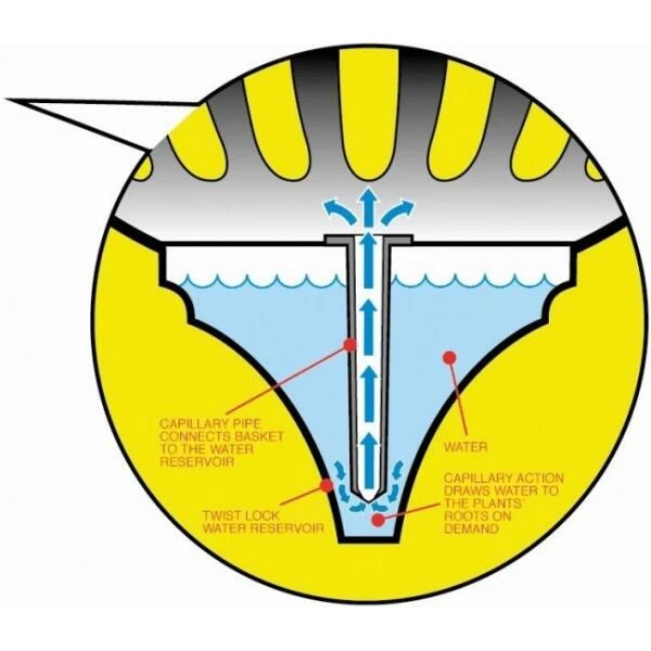 Hanging basket met besparend waterreservoir. Dagelijks gieten is niet meer nodig, dus bij het gebruik van deze hangpot bespaar je niet alleen water maar ook tijd. Het unieke ontwerp van deze hangpot is voorzien van een afdraaibaar waterreservoir. Vanuit deze watervoorraad is er een capillaire lont naar de pot voorzien zodat de planten zelf de gewenste hoeveelheid water uit de watervoorraad kunnen opnemen.