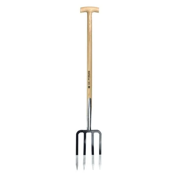 Deze spitvork van “De Pypere” is ideaal voor het omspitten van zware en lichte grond, zelfs voor kleigronden. Spitten verbetert de structuur van de grond, je kan vlotter de resten van gewassen of mest onder de grond werken en onkruid krijgt minder kans om te groeien. Ook voor het oogsten van wortelgewassen, prei, bieten, kolen,… is deze riek met brede tanden ideaal omdat je de gewassen rooit zonder schade aan te brengen. En in de siertuin is de spitriek een onmisbaar gereedschap voor het rooien van vaste planten en bloembollen.
