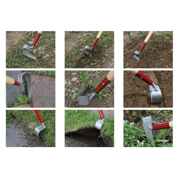 Dankzij de punt met inkeping kan je paardenbloemen of ander onkruid met penwortel snel verwijderen. Ook moeilijk bereikbaar onkruid worden makkelijk bereikbaar. Draai de hak 180° en gebruik hem om afgehakt onkruid bij elkaar te harken.